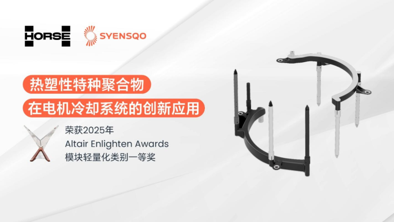 浩思动力采用世索科的先进热塑性材料Amodel® PPA,成功开发出新型电机冷却系统,其中系统冷却环及导油管与传统金属方案相比,实现了约47%的减重和36%的成本节约,且该冷却技术实现电机平均降温10度。电机冷却系统以塑代钢的创新应用,不仅降低了系统重量、提升系统冷却效果,还实现整体系统的高度集成与紧凑。目前该创新成果已成功应用到Horse 3DHT160、DHT160等智能电驱产品,实现量产上市。这一创新技术无疑完美契合Altair Enlighten Award奖项表彰可持续发展与轻量化的宗旨。